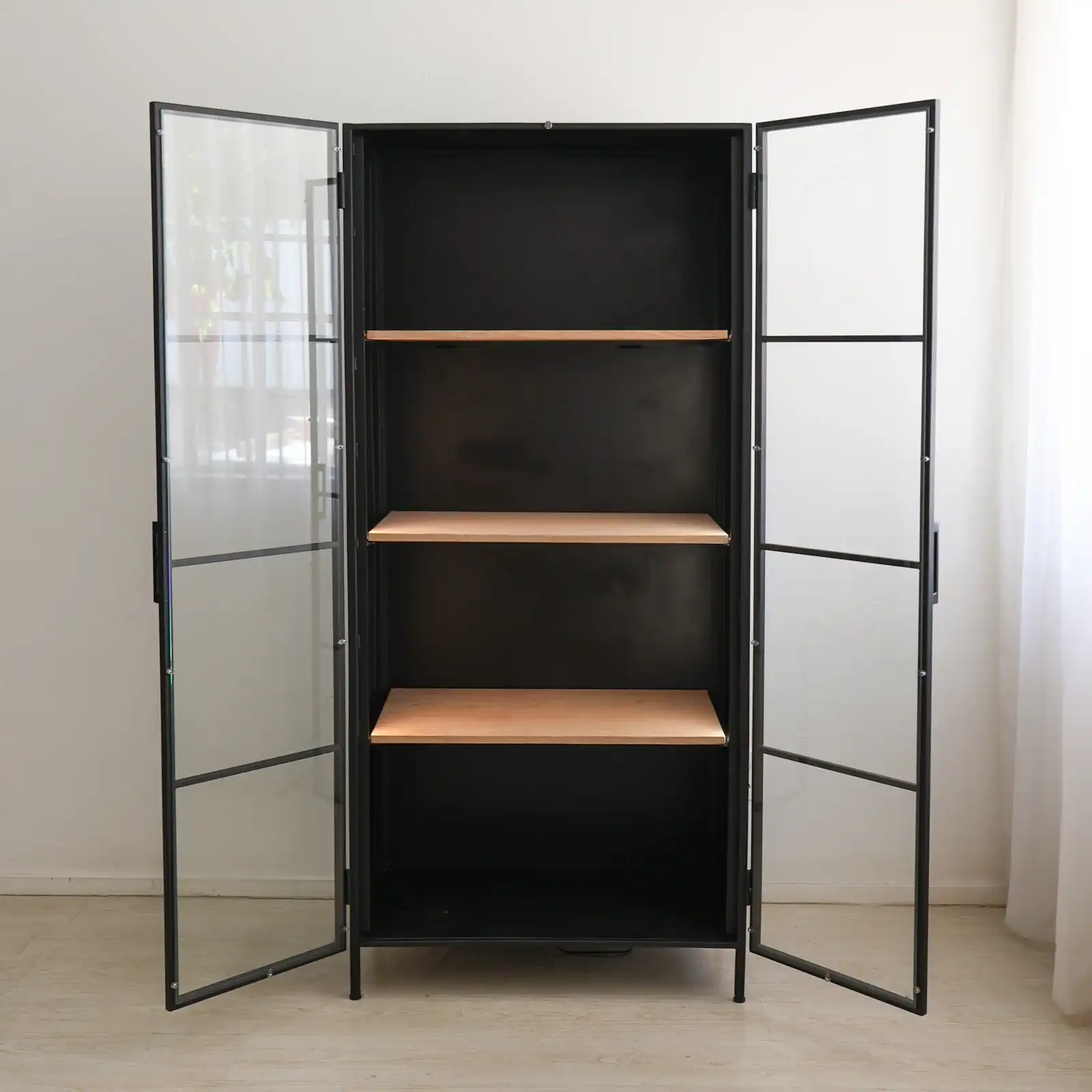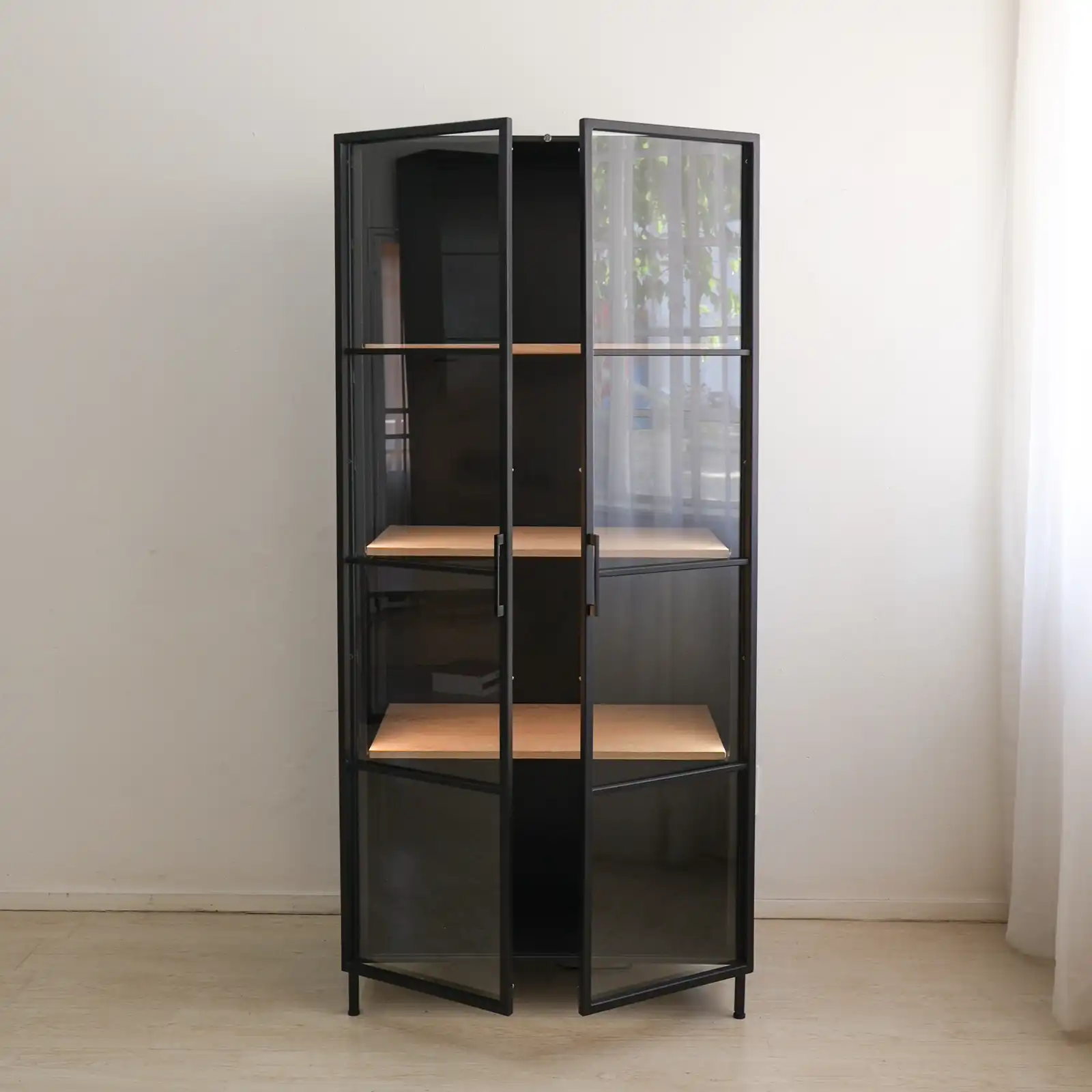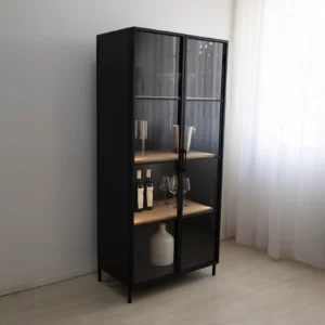 The Anaya Display Cabinet combines sleek steel, oak shelves, and glass doors in a minimalist design, perfect for stylish storage and modern living.