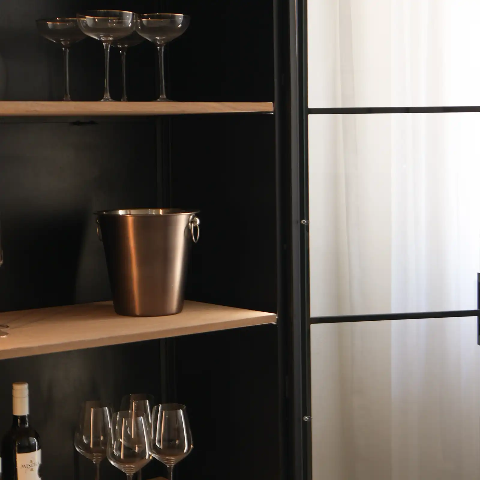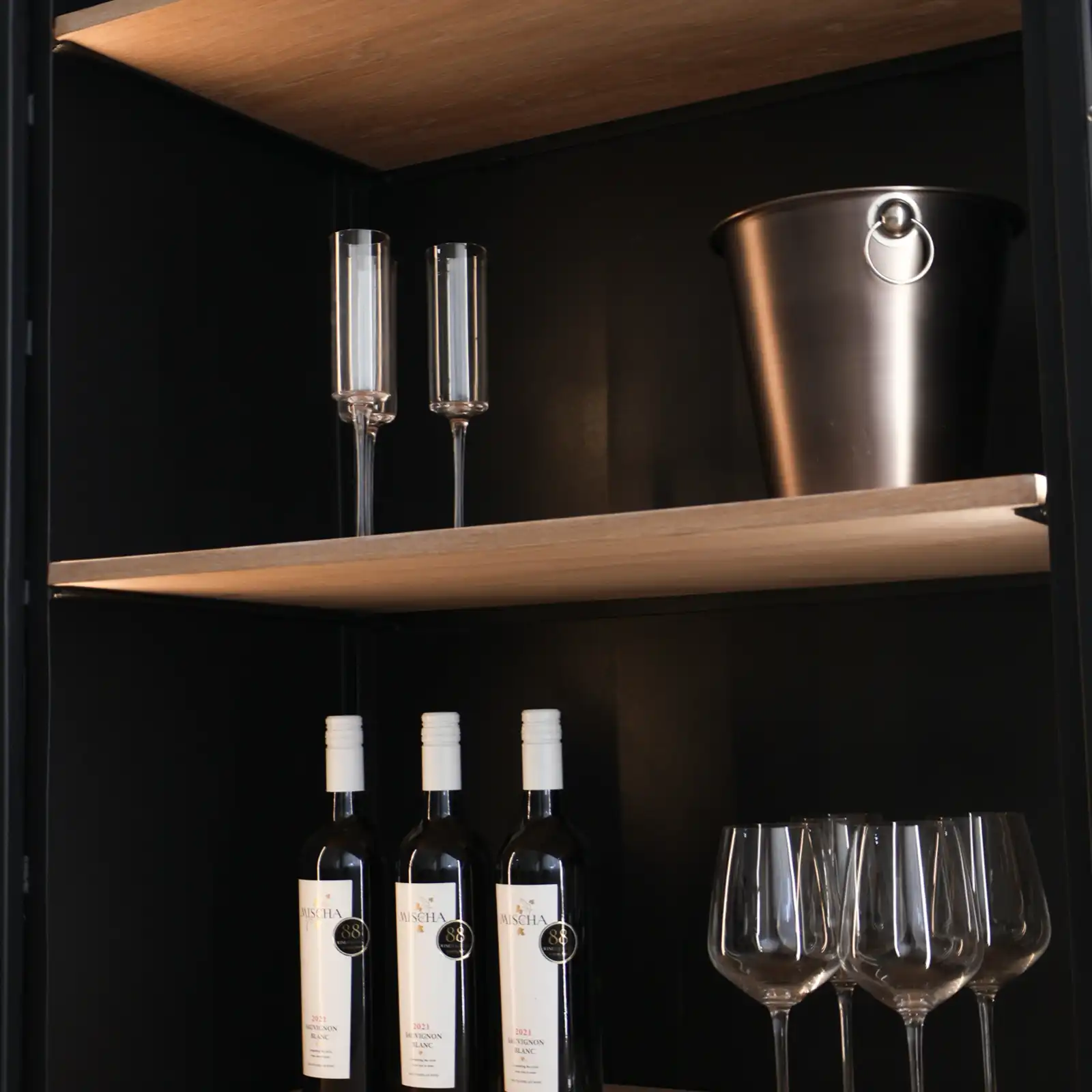 The Anaya Display Cabinet is constructed from a mixture of 19mm and 13mm tubular steel for strength and durability, with sheet metal sides, top, and bottom. The backboard is made from MDF, while the 4mm toughened clear glass doors ensure both safety and style. Inside, three oak shelves, treated with Rubio Monocoat White, provide sturdy and elegant storage.