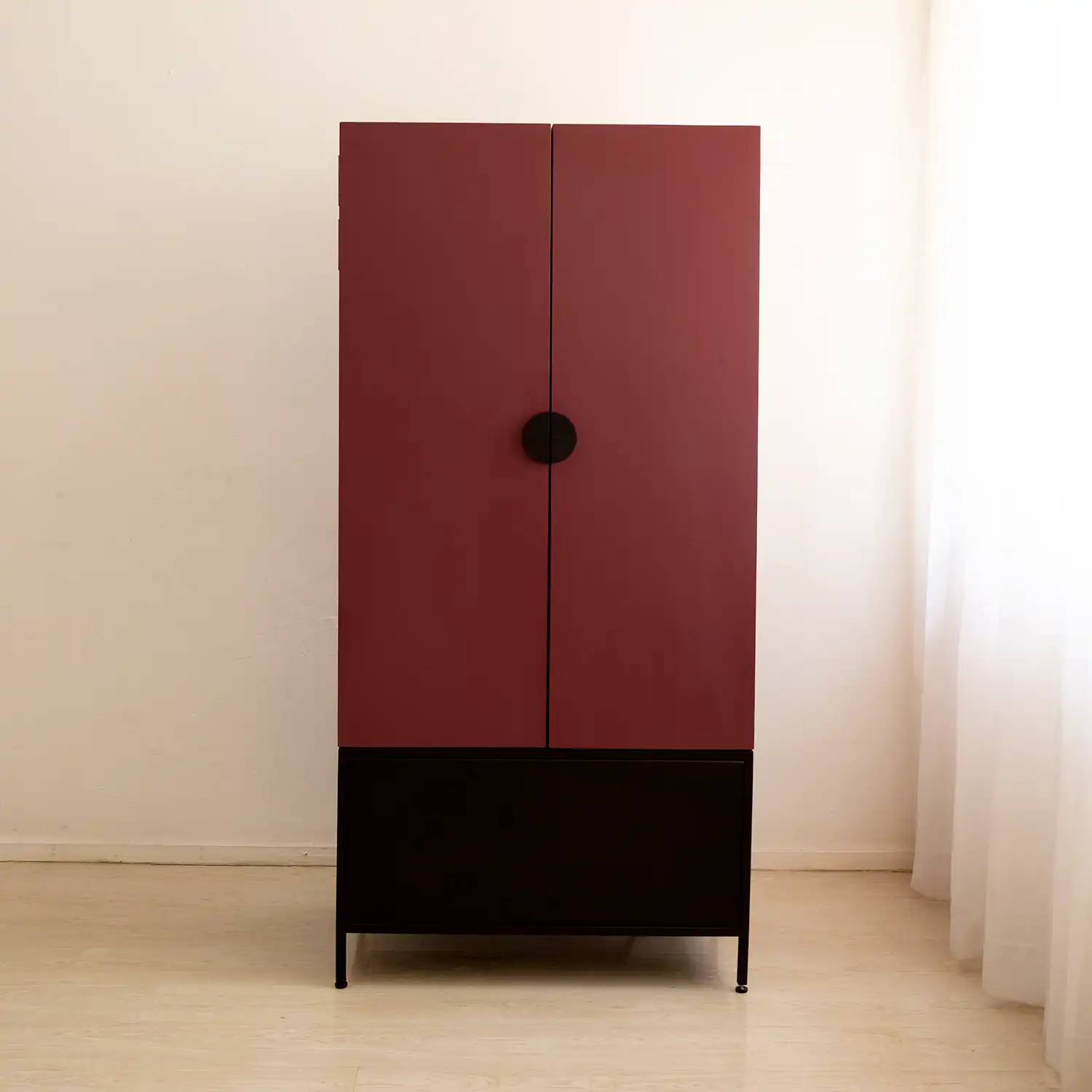 Ruby is crafted with a 19mm × 19mm square tube steel frame and MDF doors, back, and sides, finished in a striking two-tone powder coat – matte black at the base and Rocco Red above.
