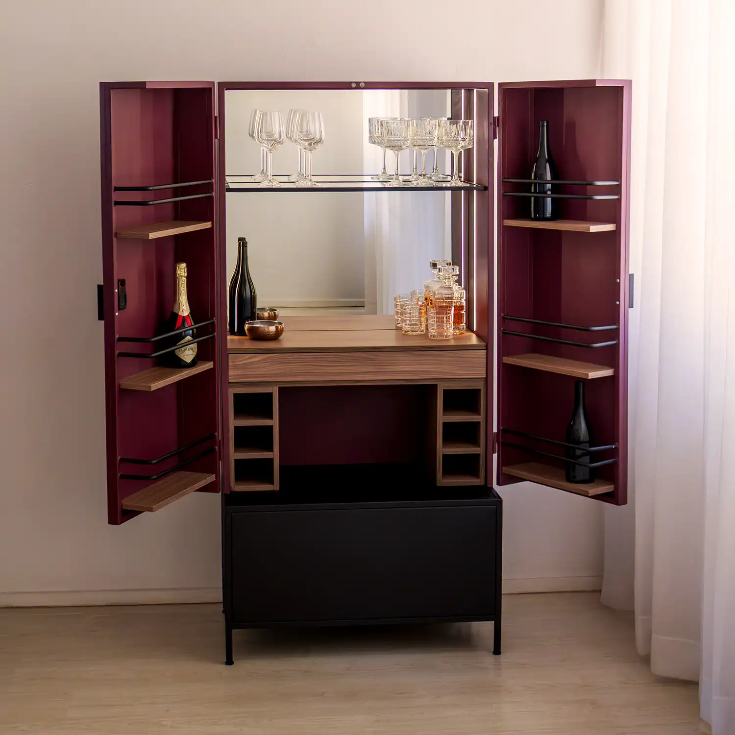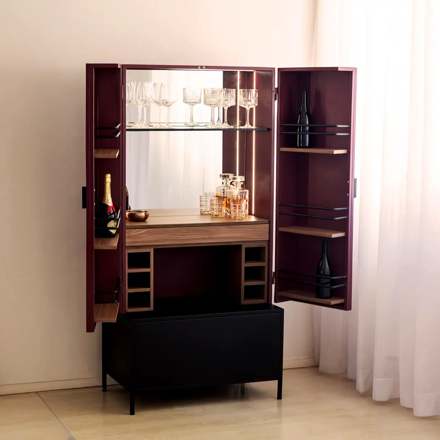 The Ruby Drinks Cabinet is a modern steel and wood liquor cabinet designed for South African homes that value both luxury and functionality. Featuring integrated wine racks, glass shelving, and smart storage solutions, this drinks cabinet is the perfect upgrade for your dining room, lounge, or entertainment space. With bold Rocco Red doors, a sleek black steel base, and the option of LED backlighting, Ruby combines practicality with statement design — making it a standout bar cabinet for any interior.