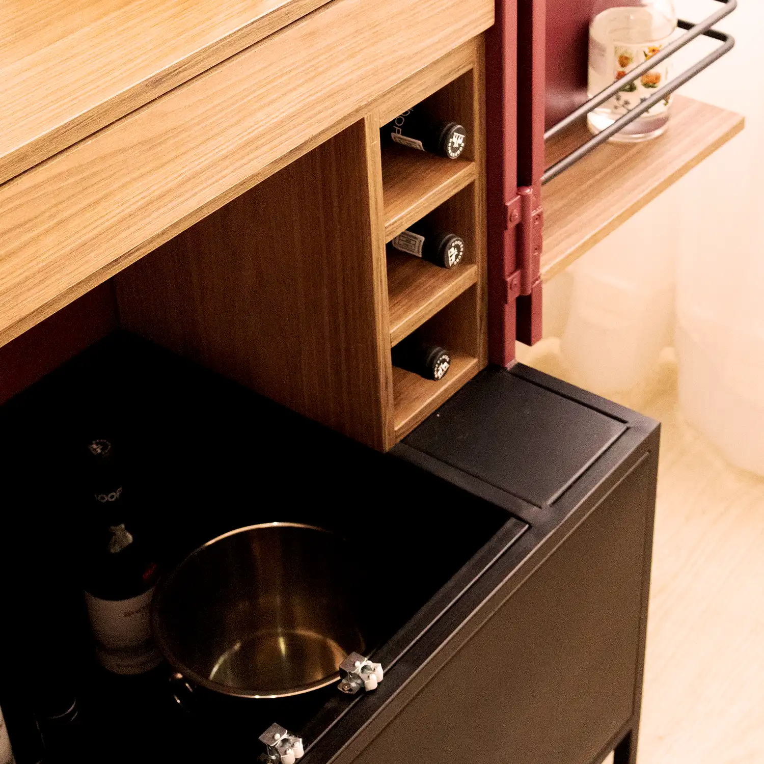 - Inside, you’ll find a mirror backboard, wine racks and shelving in French Echo Innovus melamine, a glass shelf, and a push-out drawer that doubles as a mixing surface.